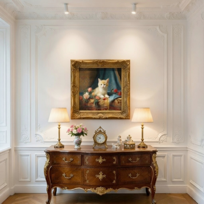 Cette série intitulée « My Cats » propose des portraits délicats et intemporels de chats, traités dans un style inspiré de la peinture classique. Chaque œuvre met en scène un félin dans un univers richement décoré, mêlant textiles raffinés, motifs ornementaux et compositions florales, créant une atmosphère douce et élégante.