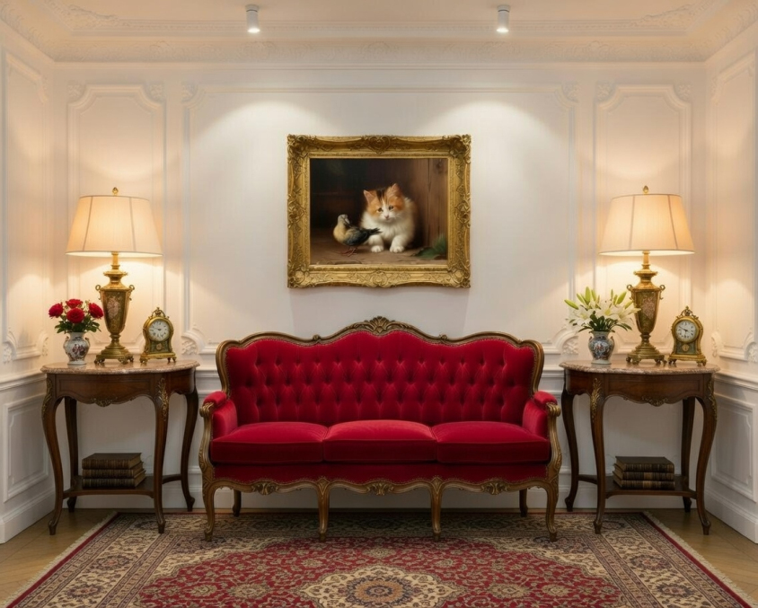 Cette série intitulée « My Cats » propose des portraits délicats et intemporels de chats, traités dans un style inspiré de la peinture classique. Chaque œuvre met en scène un félin dans un univers richement décoré, mêlant textiles raffinés, motifs ornementaux et compositions florales, créant une atmosphère douce et élégante.
